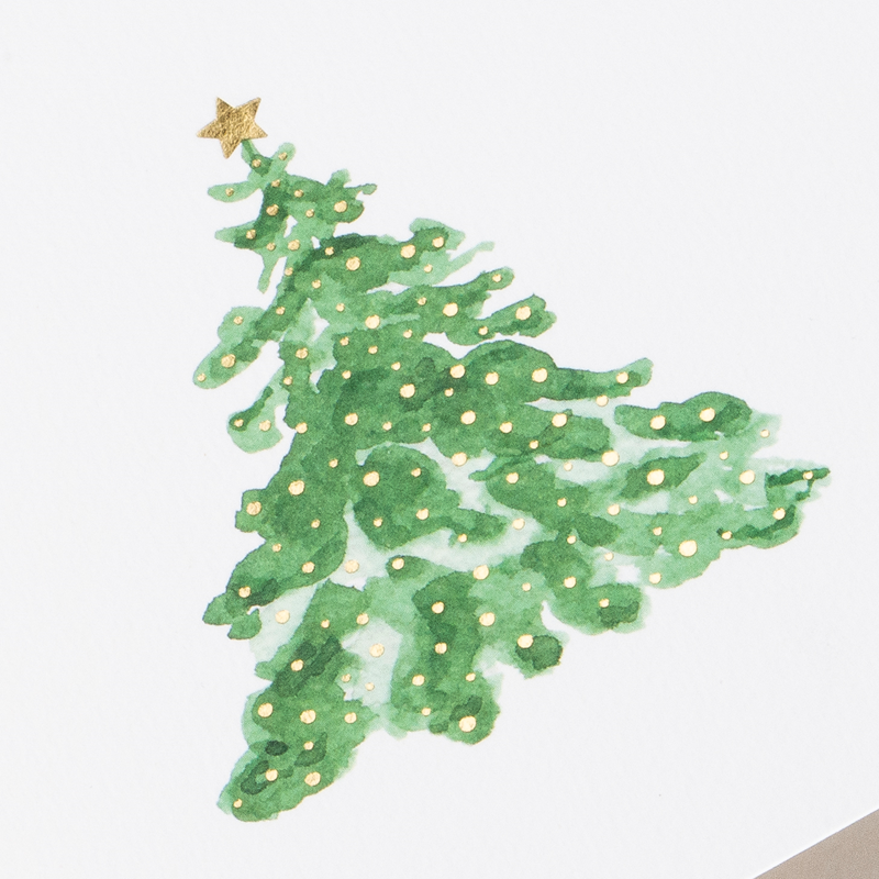 Faltkarte aus 100% Baumwollpapier. Weihnachtsbaum, mit goldenen Details und einem Stern an der Spitze, die auf den Umschlag gedruckt sind.