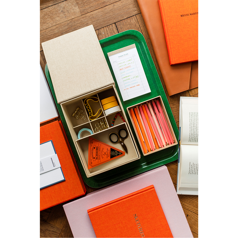 Beautiful serving tray made of FSC certified birch veneer. Printed with a scanned version of our classic bookbinding cloth in Clover Green.