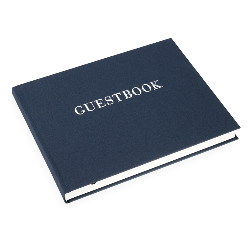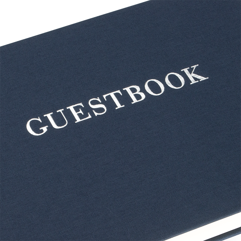 Präglad med ordet “Guestbook” i silver på framsidan. Vi kan även göra din gästbok personlig och unik med namn eller text på raden under. Välj mellan guld, silver, svart eller vitt. Hantverket utförs varsamt och noggrant i vår verkstad i Stockholm.